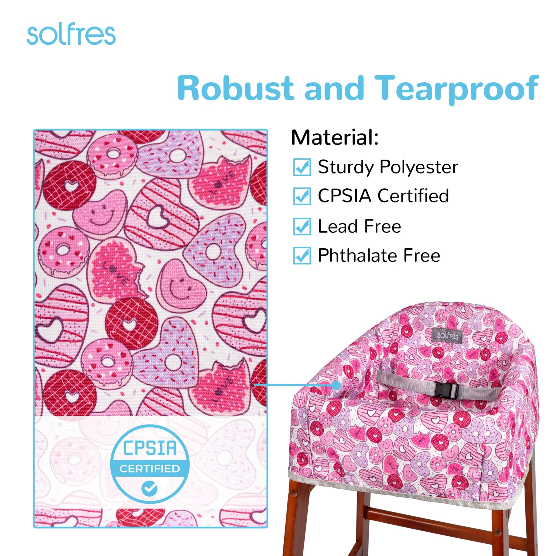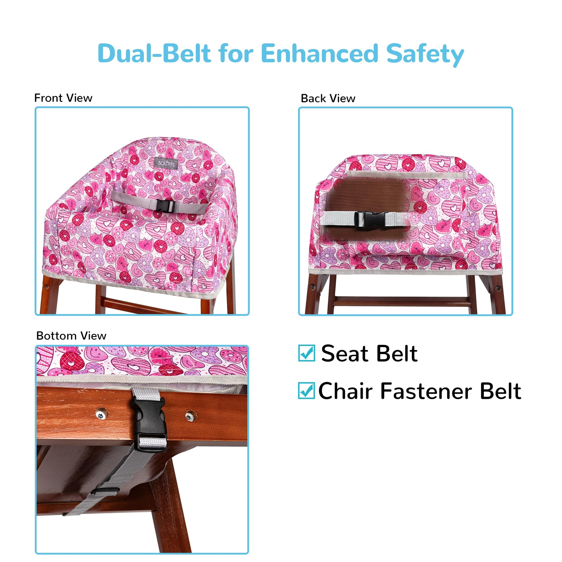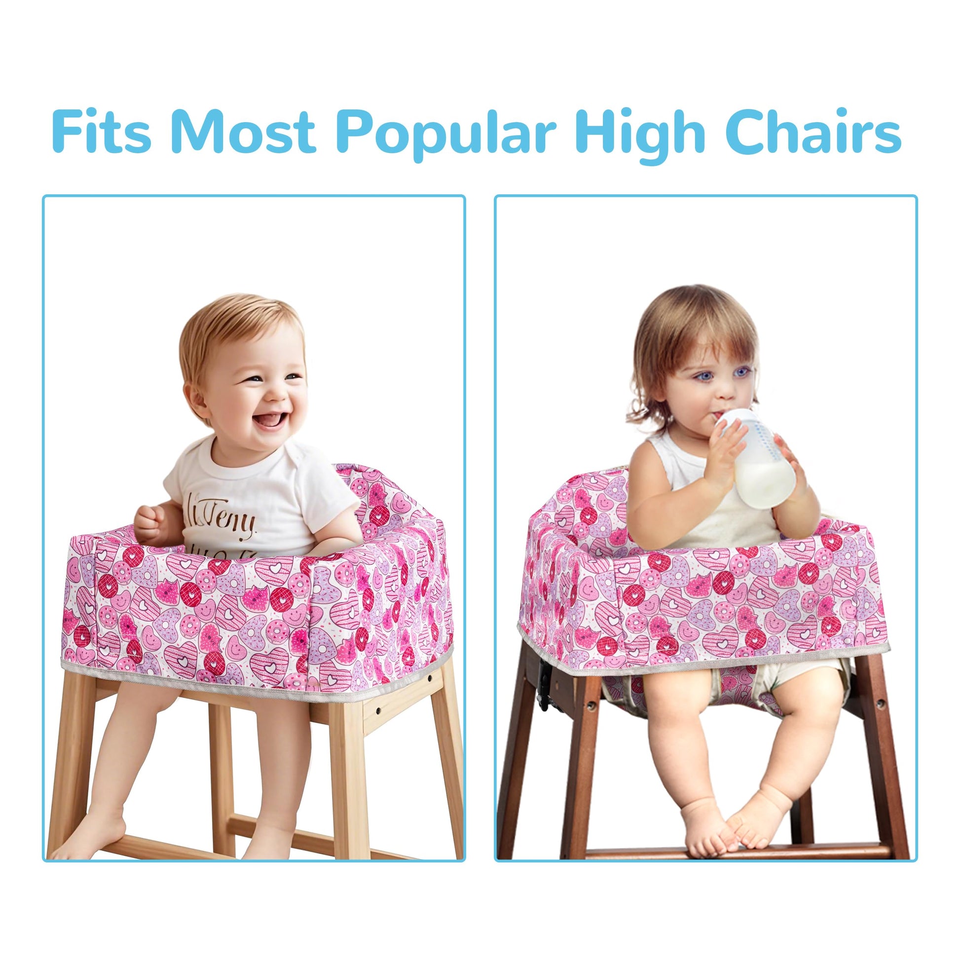 - [Upgrade Version: Enhanced Safety and More Flexible] This High Chair Protector has enhanced safety with two straps securely fastening the cover onto the bottom and back of any high chair. The strap around the back of the high chair can safely and comfortably strap your child into the chair, acting similarly to a waistline seatbelt. Compared with the old version, there is an additional buckle in the front strap making it easier for you to seat the baby safely.