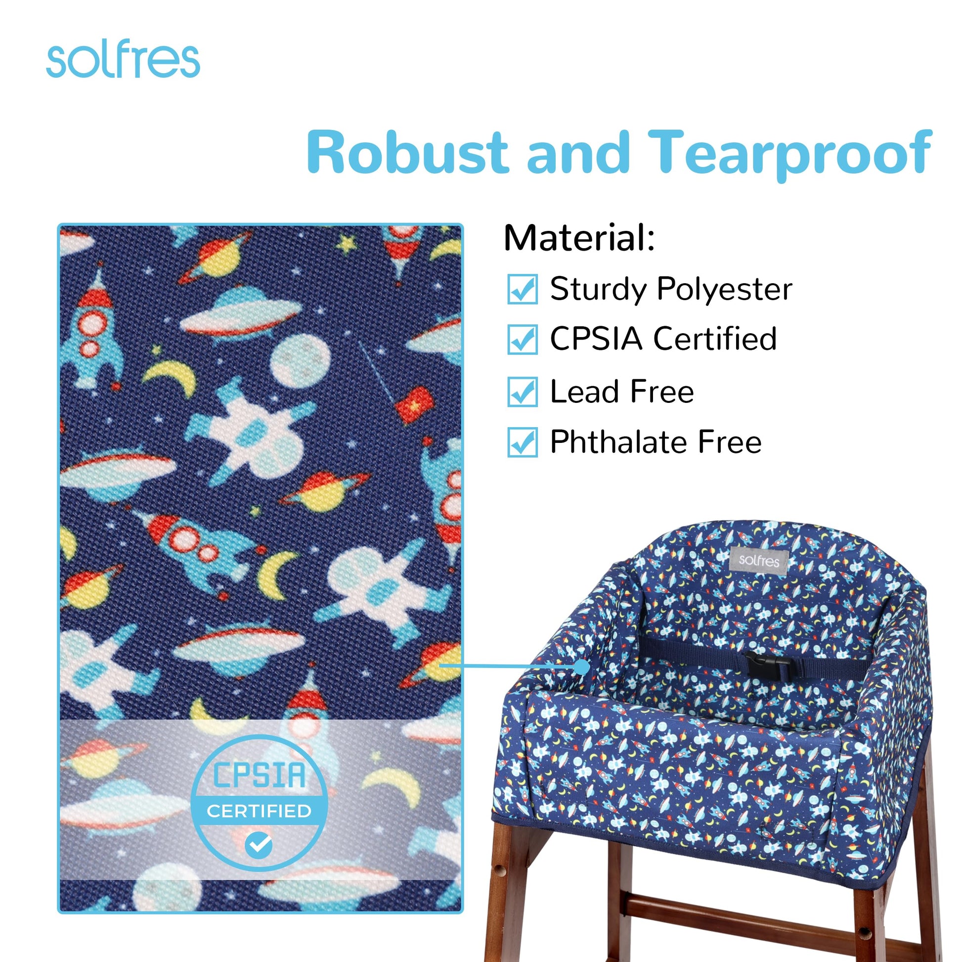 - [Easy to Setup, Pack and Carry] With practice our High Chair Protector is easily installed and packed! A built-in carry sack allows for easy storage and convenient carrying, just stow the protector into the carry pouch, which is then closed with Velcro.