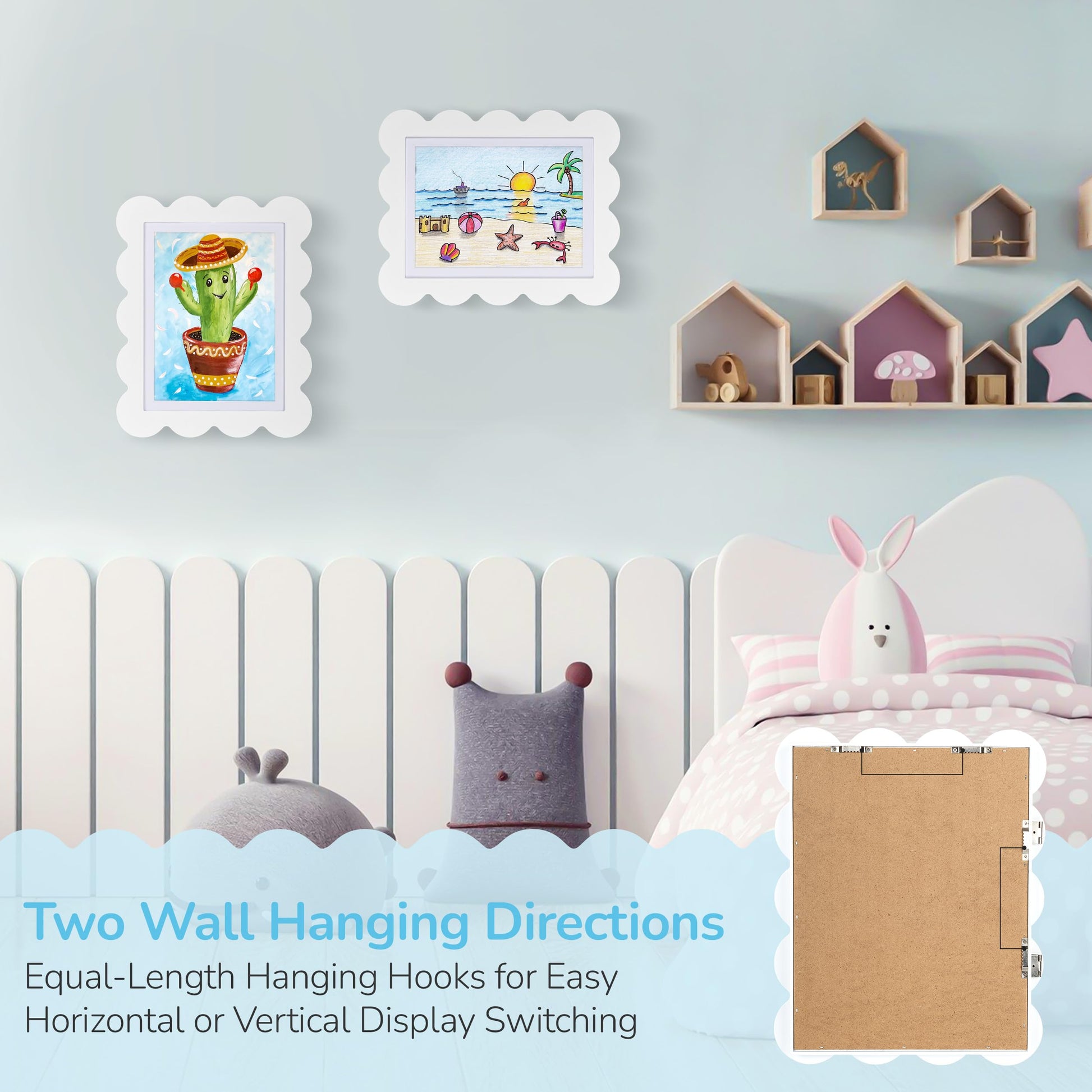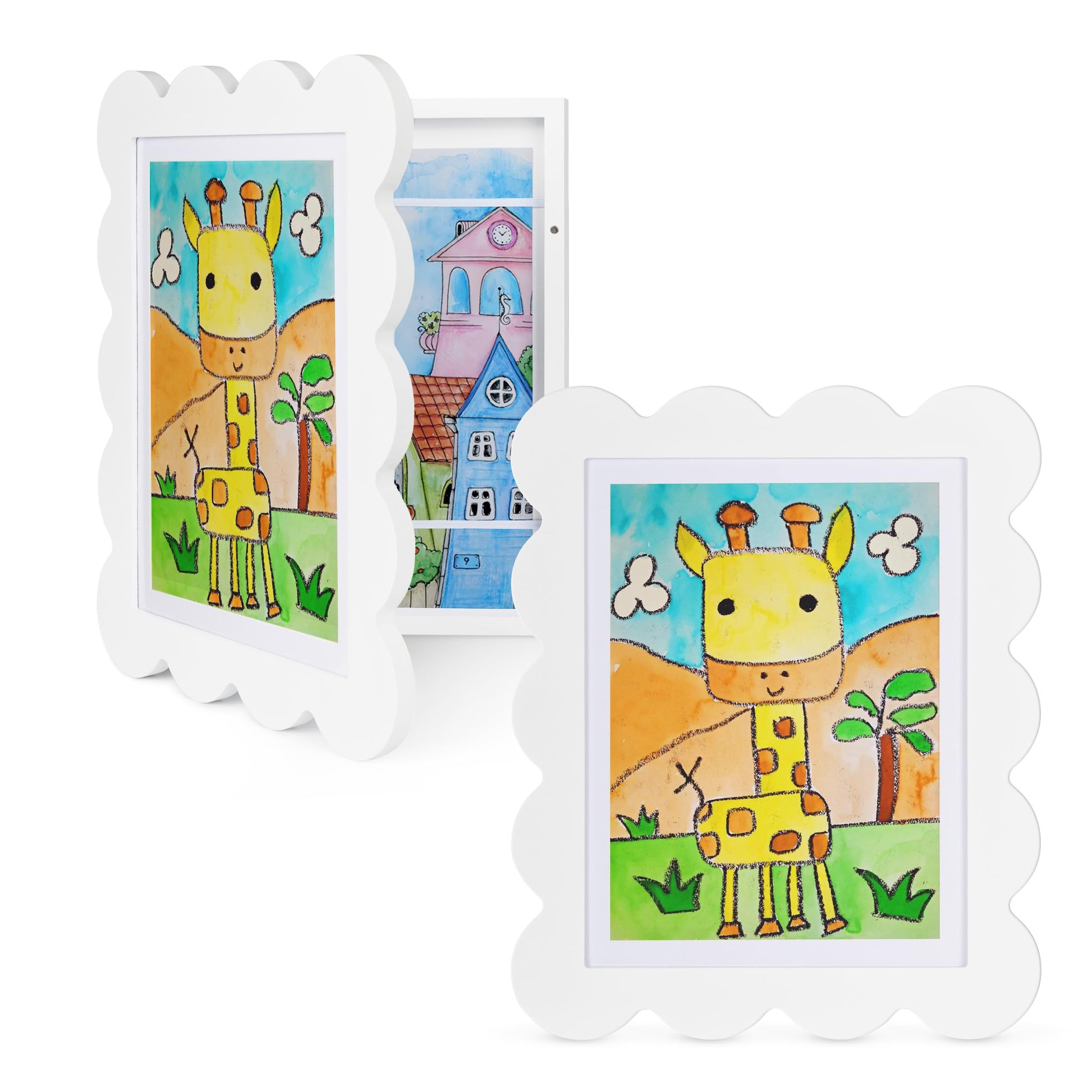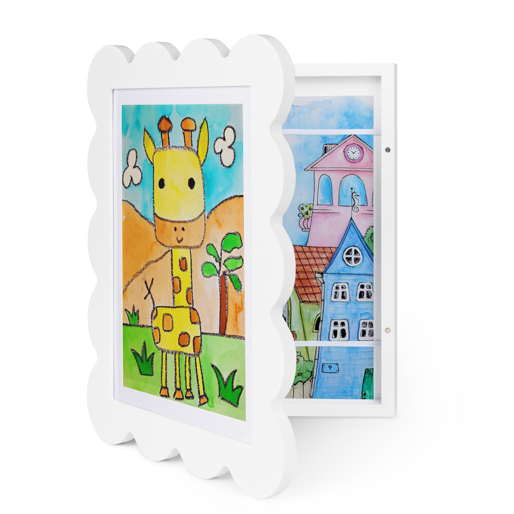 - Adorable Design for Little Masterpieces: Discover the cute kids'art frame with an original scalloped design. It showcases child's treasured artwork and stores all art pieces properly. Effortlessly display with the new backboard—no more tapes or damage.