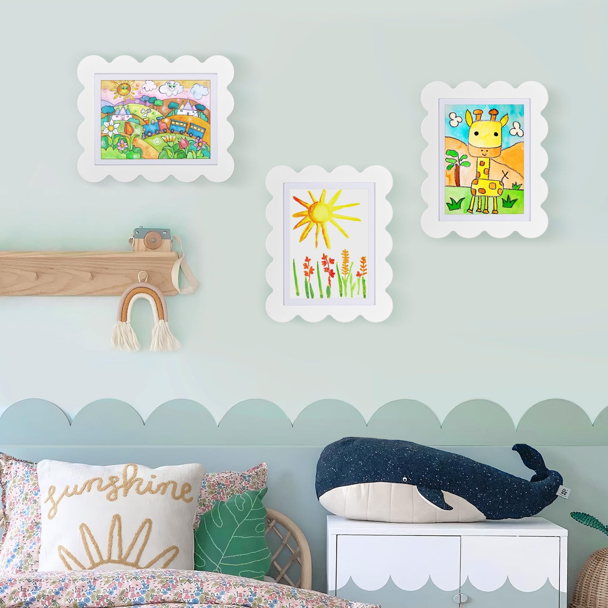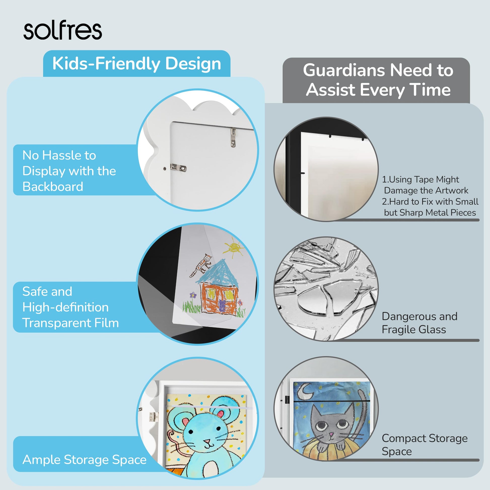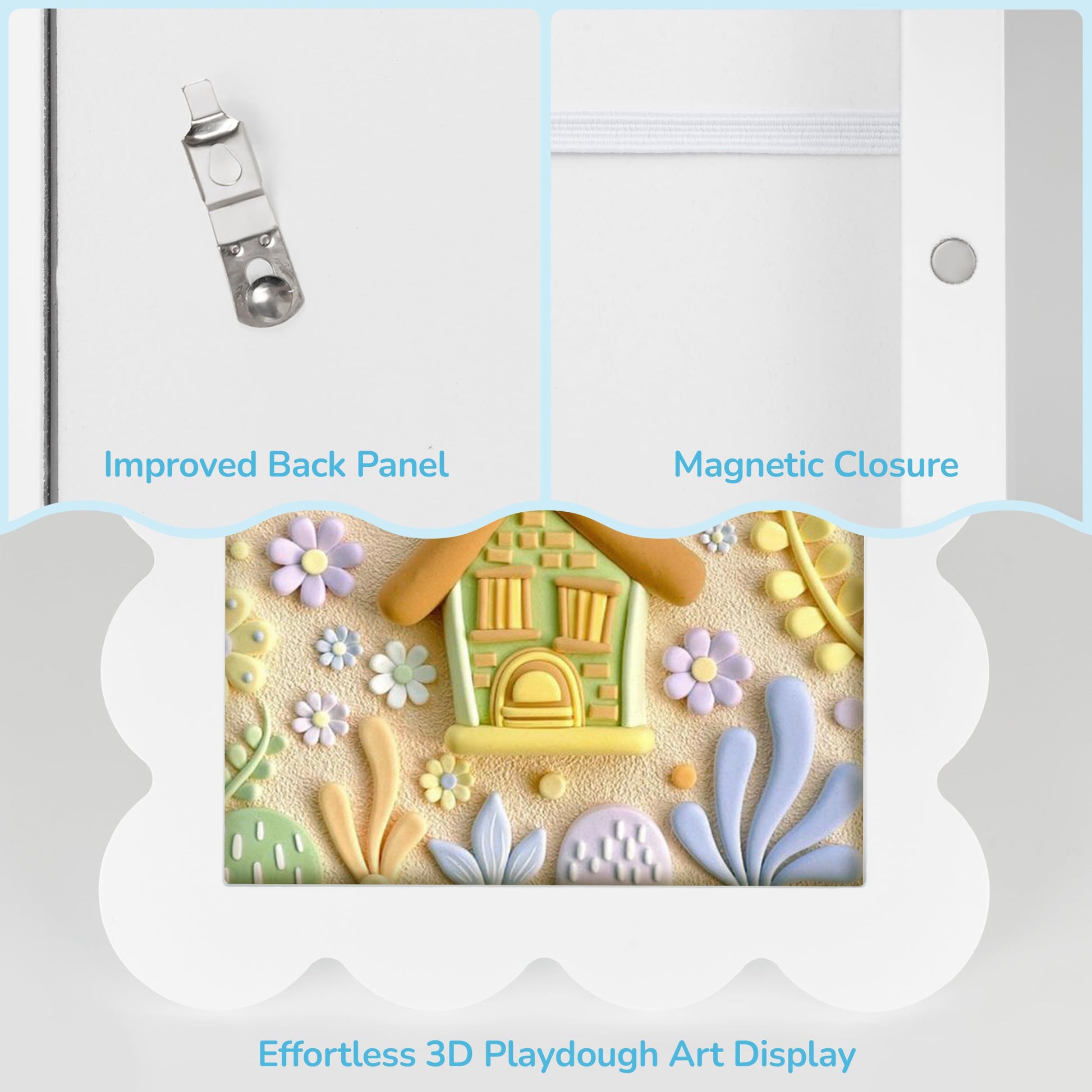 - Adorable Design for Little Masterpieces: Discover the cute kids'art frame with an original scalloped design. It showcases child's treasured artwork and stores all art pieces properly. Effortlessly display with the new backboard—no more tapes or damage.